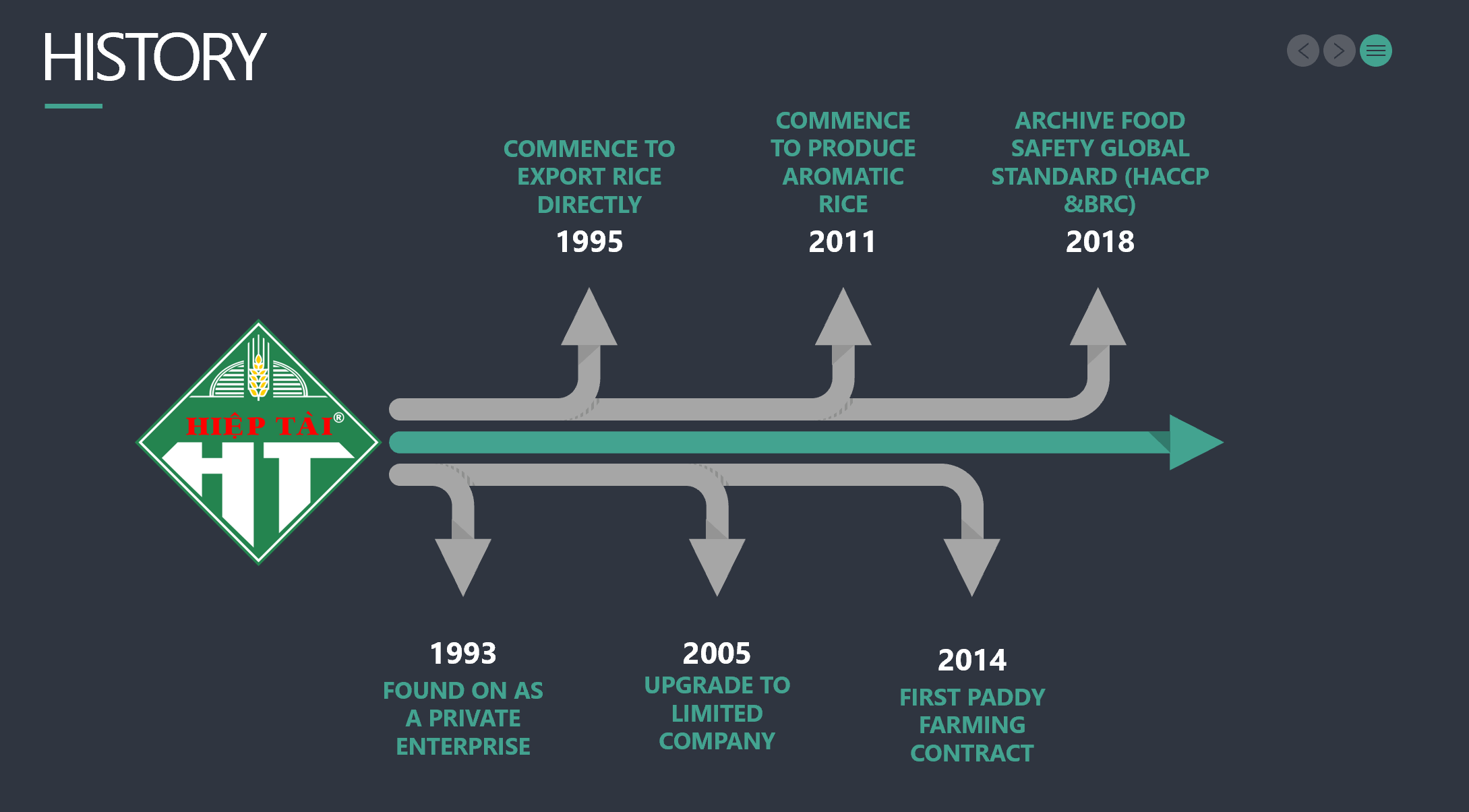 Công ty TNHH Hiệp Tài được thành lập từ năm 1993 với tiền thân là Doanh nghiệp tư nhân Hiệp Tài. Được thừa hưởng kinh nghiệm sản xuất và xuất khẩu lúa gạo hơn 25 năm, hiện nay Hiệp Tài đã và đang hoàn thiện dần chuổi sản xuất gạo khép kín hoàn toàn với mô hình cánh đồng mẫu lớn với việc kiểm soát chất lượng và truy suất nguồn gốc rõ ràng, cùng với nhà máy sản xuất đạt chứng nhận an toàn thực phẩm quốc tế HACCP và BRC (chứng nhận bỡi SGS).