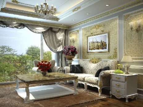 Trong ảnh là phòng khách có phong cách cổ điển với cách dùng chỉ tường, các vật dụng nội thất nhiều họa tiết hoa văn tỉ mỉ và mảng đá hoa cương trên tường kiến tạo vẻ sang trọng, lộng lẫy. Hệ thống chiếu sáng tinh tế cùng cách bố trí đồ nội thất đem lại hiệu quả không gian thoáng đạt cũng như cảm giác thư giãn cho chủ nhân. Bộ đèn chùm trang trí, bộ sofa và màn cửa trắng giúp [...]