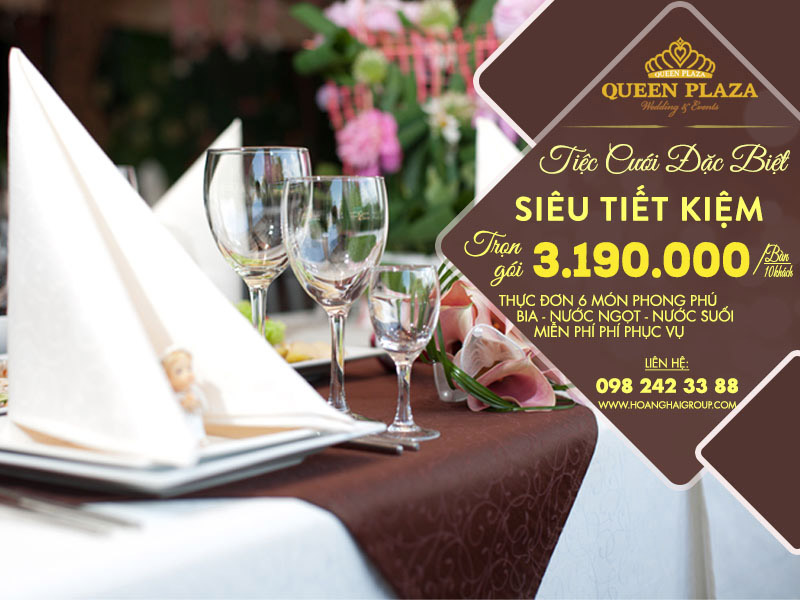 Đồng hành cùng các đôi uyên ương trong mỗi sự kiện trọng đại, Trung tâm Hội nghị & Tiệc cưới Queen Plaza hân hạnh mang đến Chương trình “TIỆC CƯỚI TRỌN GÓI SIÊU TIẾT KIỆM”, với những ưu đãi cực kì hấp dẫn và tiết kiệm. Với chương trình này, Queen Plaza mong muốn ngày cưới của đôi bạn sẽ thêm trọn vẹn và ngập tràn hạnh phúc.
